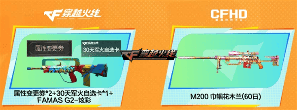 如果玩家符合7月期间在CF和CFHD都活跃过至少一局的条件,只需8月再在CF和CFHD再活跃一局,即可立即领取属性变更券*2+30天军火自选卡+FAMAS G2-炫彩的CF专属礼品与M200-巾帼花木兰(60日)的CFHD好礼。