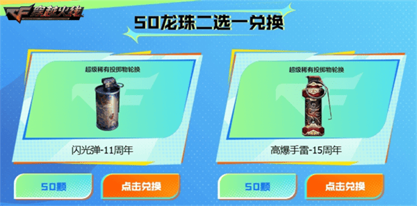 除以上补给装备外,本次活动还有50颗终极龙珠兑换闪光弹-11周年及高爆手雷-15周年的超稀有投掷武器兑换渠道限时开放,有意向收集使用的CFer千万不要错过。