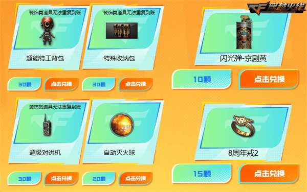如果CFer无意兑换角色,还可以选择使用终极龙珠在高级战利品兑换专区挑选心仪的武器道具,超能特工背包、特殊收纳包或超级对讲机仅需30颗终极龙珠即可兑换,使用20颗终极龙珠还可以兑换自动灭火球,还有闪光弹-京剧黄仅需10颗终极龙珠即可兑换,8周年戒2也可使用15颗终极龙珠兑换领取。