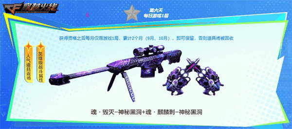 如果CFer属于新签约玩家,将需要完成每日游戏1局,并在该自然月中累计完成6天的任务才能进行签约。而在累计游戏天数的过程中,玩家还可以领取对应好礼,活跃3天即可获得尼泊尔-牡丹,而活跃6天则可领取魂·毁灭-神秘黑洞+魂·麒麟刺-神秘黑洞(道具+资格)。