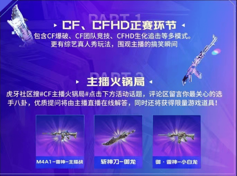 除了紧张刺激的巅峰对决,本次CF专场还为您准备了丰富多彩的直播内容。8月3日19:00,锁定直播间【660120】,您将有机会亲眼见证这场电竞盛宴的每一个精彩瞬间,更有机会领取CF稀有道具,让您的游戏之旅更加丰富多彩!此外,主播们还将带来别具一格的火锅八卦局,让您在享受电竞激情的同时,也能感受到轻松愉快的氛围。