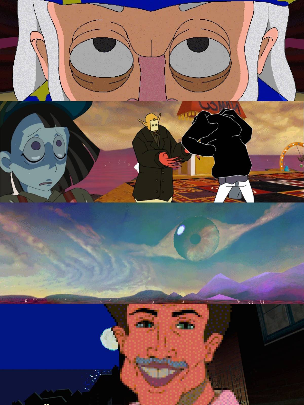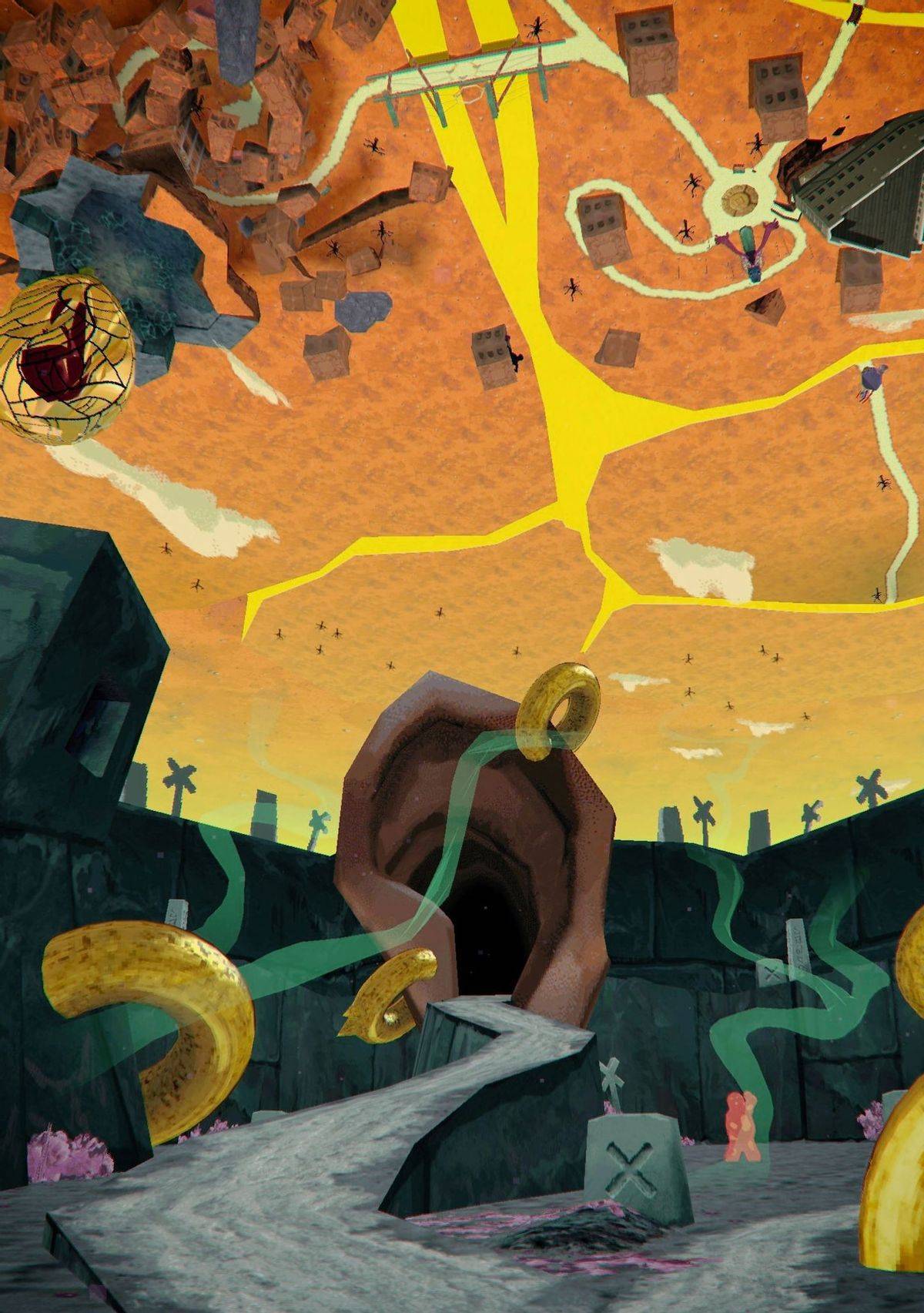 就这么来形容《ENA》的视觉体验吧:把你人生看过的所有艺术的、非艺术的、抽象的、具象的、像素的、二维的、3D的、东方的、西方的、神仙下凡的、阴间爬出来的、用脚画的、用舌头画的视觉元素,全部塞到一个巨型压缩机里融合成方块,再扔到自动麻将机里洗个800轮,最后让你家分不清萝卜纸巾的猫从里面随机筛选一轮,然后一股脑塞到制作者的嘴巴里嚼嚼嚼,吐出来就成了它——