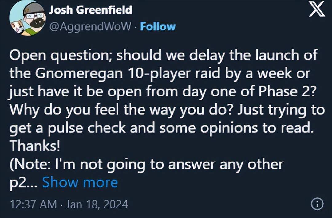 近日,暴雪高级游戏制作人Josh Greenfield在推特发出了询问,征求玩家的意见:全新的十人团本诺莫瑞根团本应该延迟一周开放?