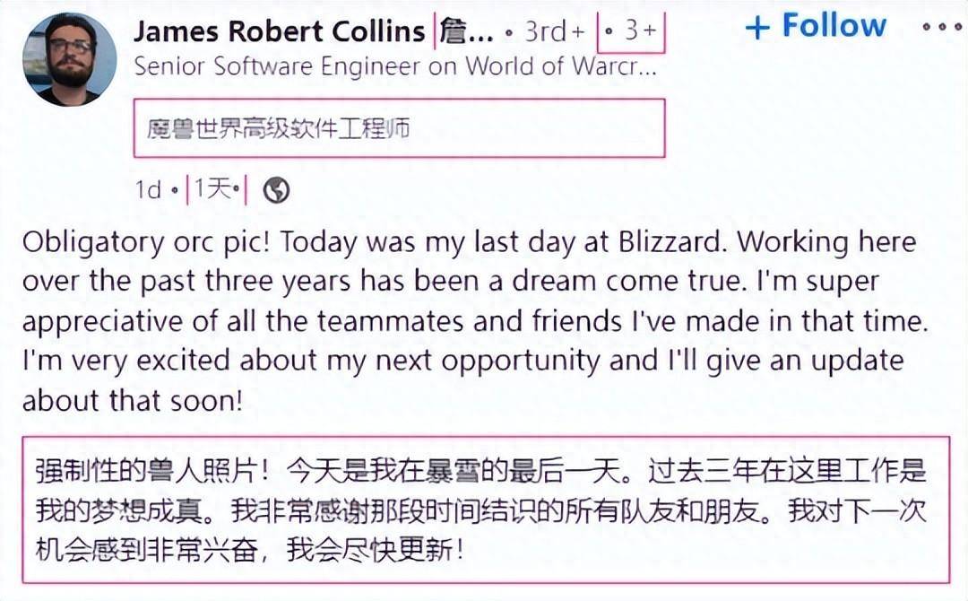 高级软件工程师 James Robert Collins 近日宣布,他已经离开暴雪。他2021年进入暴雪为魔兽世界工作了近三年,最主要的贡献就是制作了巨龙时代资料片中的骑龙飞行系统,该系统在11.0地心之战资料片中会得到进化。