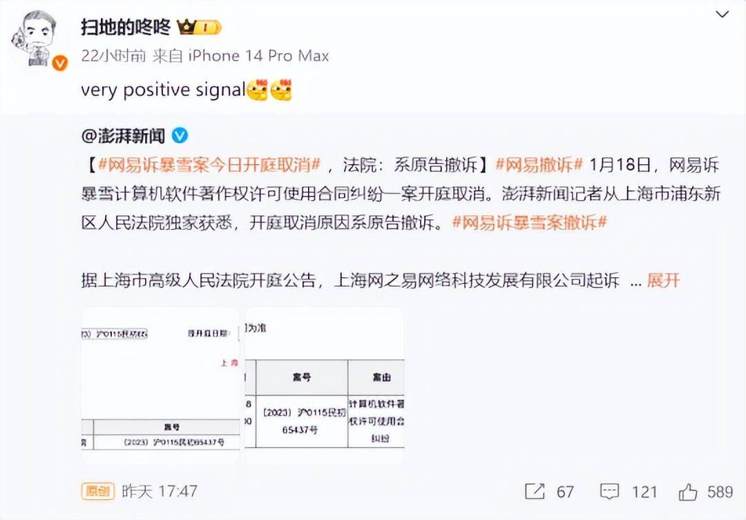 1月18日,网易诉暴雪计算机软件著作权许可使用合同纠纷一案开庭取消。相关媒体记者从上海市浦东新区人民法院独家获悉,开庭取消原因系原告撤诉。这也意味着网易从去年开始状告暴雪拖欠3个多亿的案子,最终还是没有取得什么实质性的进展。