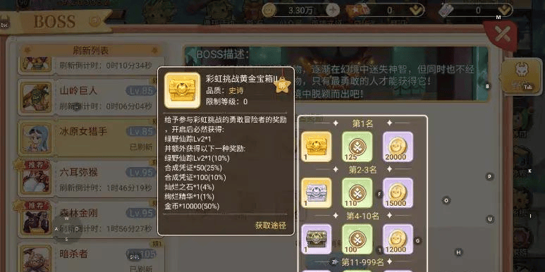 每个野外boss场地限制进入20人,进入的玩家根据对boss造成的伤害结算排名奖励,名次越高奖励越好,boss被击杀后会随机发放1份幸运奖励,杀死boss后也会进入刷新倒计时。