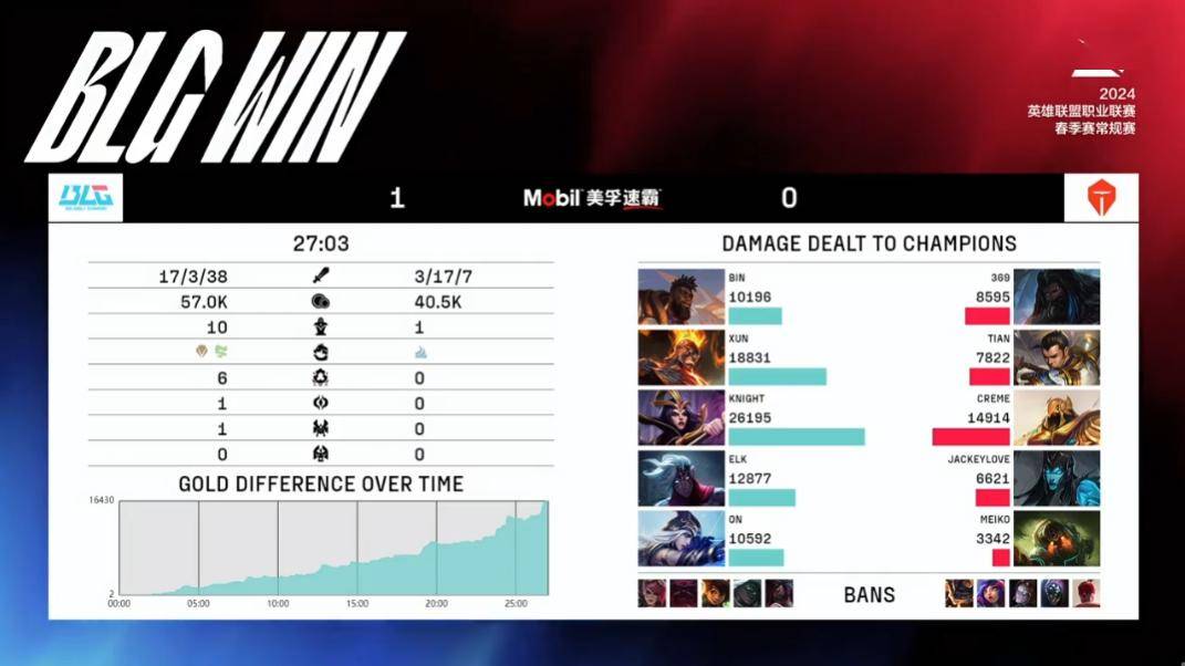 Xun的火男8-0-8超神结束了第一场比赛,这也是BLG非常碾压的一场胜利。TES几乎是从下路崩到野区,再崩到中路,只有前期参与感不强的上单发育比较正常。Knight妖姬和Xun的火男前期给了TES太大压力,双人组也没能打出优势,上半区还让出了全部的虚空巢虫,因此BLG带着新赛季的强力Buff很快推平了TES。