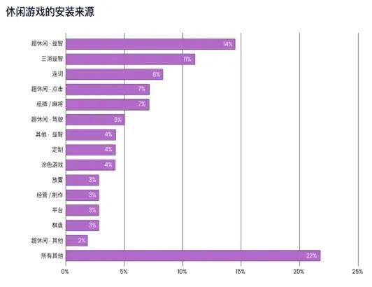 Liftoff在下载来源品类分析中发现,超休闲游戏在所有游戏品类中仍然是一个重要的安装驱动因素,占比29%。而休闲游戏的下载来源中,三消游戏贡献了11%,其热度和吸金能力也不言自语。2023.2至2024.2的12个月期间,休闲游戏类型的创新性让人眼前一亮。作为活跃且创新的类型,3D堆叠消除游戏和麻将接龙游戏在市场上脱颖而出。