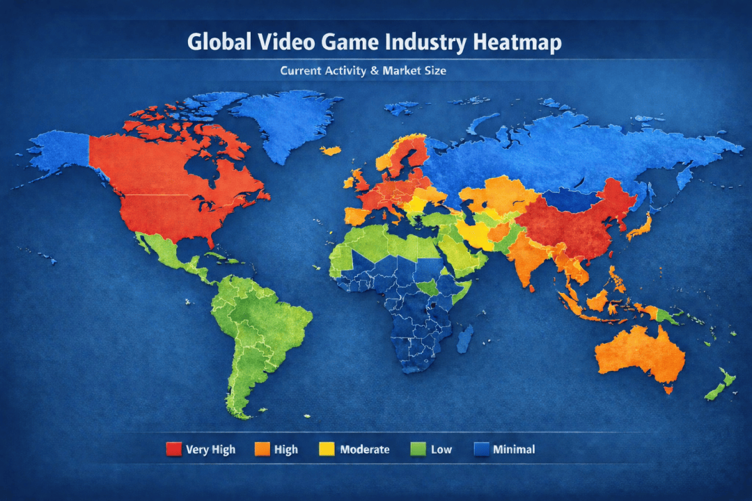 象征极热的红色,出现在北美、东亚与欧洲;色温更低一些的次热地区,由东南亚、中东、澳洲和南美组成;而非洲的大片土地以及人迹罕至的北亚,则几乎游离在世界游戏版图之外。