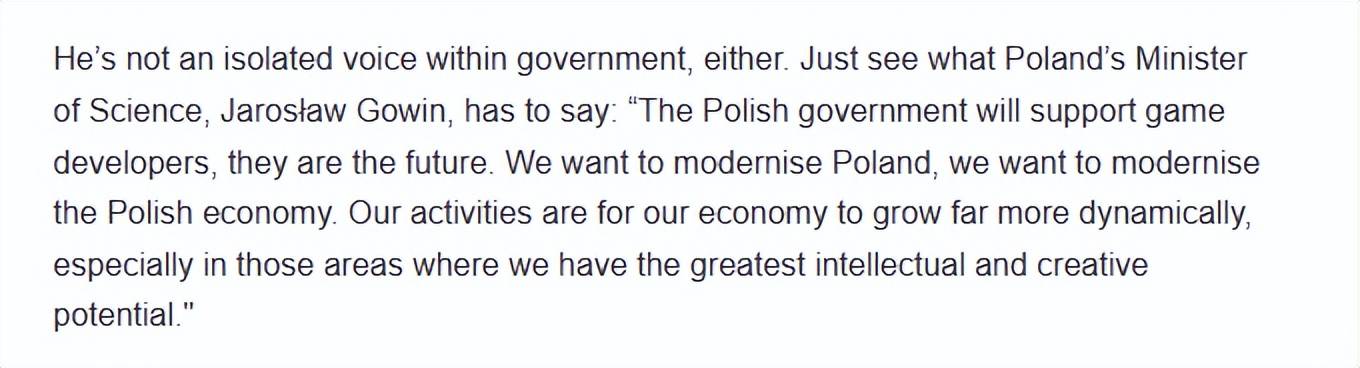 波兰科学部长雅罗斯瓦夫·戈温的表态更加直接,他曾说:“波兰政府将支持游戏开发者,他们代表着未来。我们希望波兰现代化,我们希望波兰经济现代化。我们的行动旨在促进经济更强劲的增长,尤其是在我们拥有最大智力和创造潜力的领域。”
