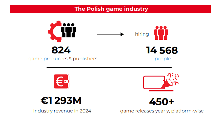 如今,波兰游戏行业依然在不断壮大,据波兰企业发展署(PARP)最新发布的《波兰游戏产业——2025年报告》显示,目前,波兰有约824家活跃的游戏开发商与发行商存续,行业直接就业人数为14,568人,每年发布的游戏数量超过 450款,游戏行业的整体收入已达13亿欧元。