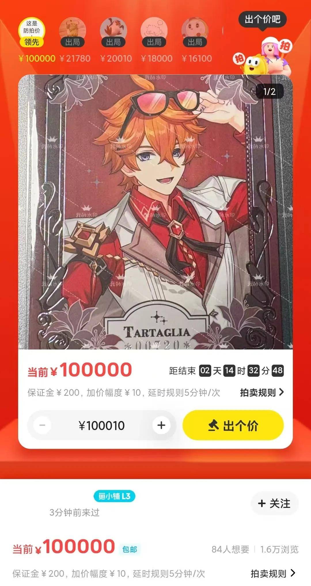 起初,其价格的上涨还算正常,基本是10块或几十块的往上加,慢慢的,加价的幅度变为了几百块,围观的人也从几十慢慢涨到了几百几千,随时间推移,这张达达利亚生日编相卡价格的飙升,招来了倒爷、黄牛、乐子人等多方势力,其价格也最终发展到了脱离现实的地步。