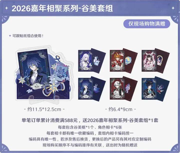 今年,官方也为在原神FES现场购买周边的玩家,准备了消费不同档位的购物赠品,其中最高档为单笔订单累计消费满588元,所赠送的一套2026嘉年相聚系列-谷美套组,具体实物就是绘有达达利亚、阿蕾奇诺、哥伦比娅等角色特殊立绘的彩色角色相卡6张,与一个让整个套组看起来更加精美的“谷美框”。