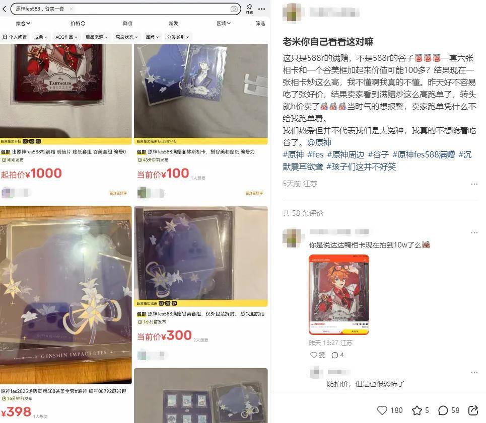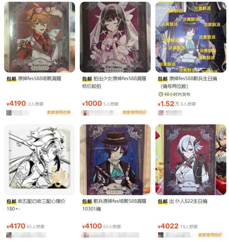 目前在二手电商平台上搜索后不难发现,有许多带着特殊编号的原神谷美套组被拍到了天价,虽然过万的不多,但只要编号特殊,基本都能几百上千,且围观者甚多,有些价格被炒高是因为部分玩家想淘到与自己生日相对应的编码,但能高到如此地步,与其中别有用心者也有一定关系。
