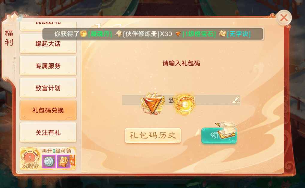 大话手游2026最新礼包码使用方法:游戏等级达到10级之后,主页面左上角→点击【福利】→礼包码兑换→输入礼包码。