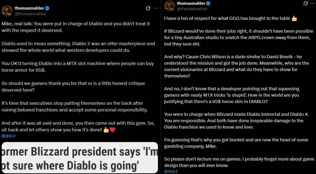 眼看迈克·伊巴拉油盐不进,托马斯决定抢占舆论高地,以“玩家”而不是“游戏制作人”的身份,向对手发起质疑:“是你,同意将‘暗黑破坏神’系列变成一台氪金老虎机,让人们可以花65美元购买马匹和盔甲。那么,我们玩家应该为此感谢你们,还是应该作出一些诚实的批评呢?”