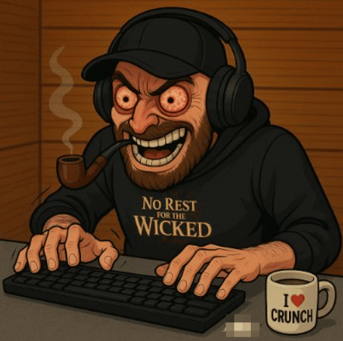 他的账号头像,画的便是一个狂暴输出的“键盘侠”。而马克杯上的英文单词更是表现着他“乐子人”的混沌体质:Crunch是打枪游戏里“蹲点阴人”的意思,用中文互联网骂战的名词翻译,就是“钓鱼”——一个人故意说“蠢话”,吸引钓上来的鱼红温、破防、出丑。