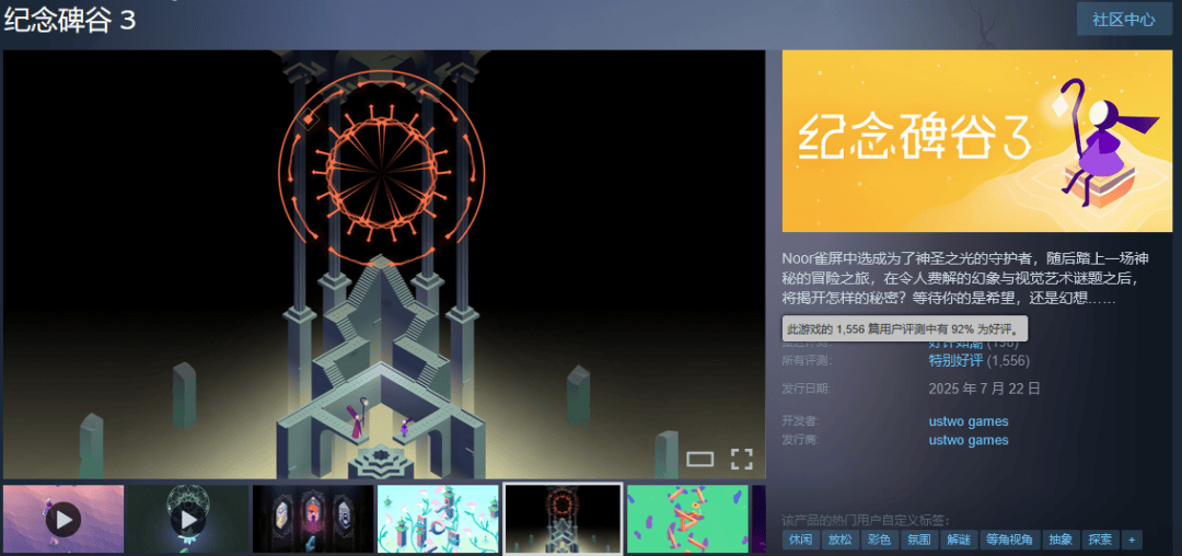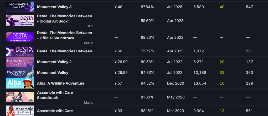 而在去年夏季,《纪念碑谷3》就已经登上了PC和各大主机平台,其中Steam取得了特别好评。但据统计网站Gamalytic的数据,《纪念碑谷3》在Steam的销售额预估为52万美元,无论是放在Steam这个独立游戏爆款频出的平台还是对IP本身来说,这一数字都远远算不上出众。