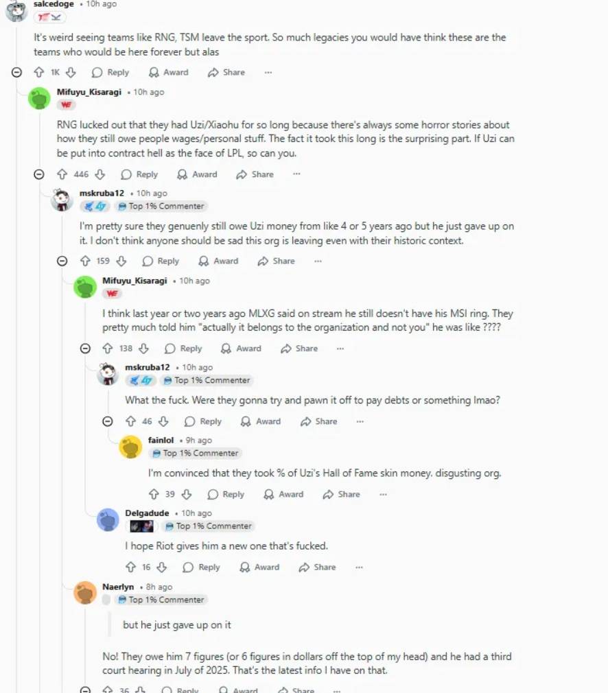 但更多了解真实情况的网友们开始痛批RNG这支队伍,认为这支队伍其实就是LPL赛区的罪人,因为卡合同导致Uzi迟迟不能复出,而且在LPL赛区可以说是恶贯满盈,场外各种官司不断,公司的经营人被列为老赖,场内也是各种卡选手合同然后欠薪不给。