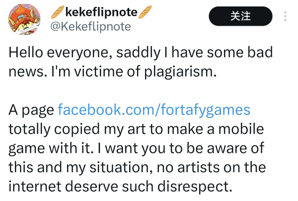 “大家好,很遗憾要告诉大家一个坏消息:我遭遇了抄袭。一个叫fortafygames的公司完全盗用了我的作品,用来制作一款手机游戏。我希望大家能了解这件事和我的处境 —— 网络上的创作者都不该受到这种不尊重。”