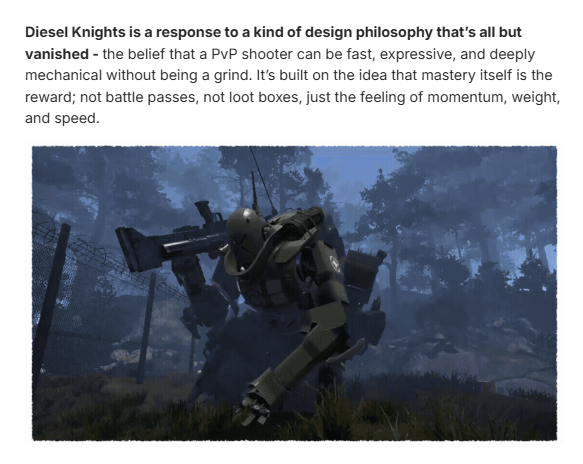 “《柴油骑士》是对一种几乎已经消失的设计理念的回应——即PVP射击游戏可以兼具快节奏、表现力和深度化机制,而且不必去肝。这款游戏基于这样的核心理念打造:精通(Mastery)本身就是一种奖励。并非战斗通行证或战利品开箱,我们追求的是那种动感、厚重感和速度感。”