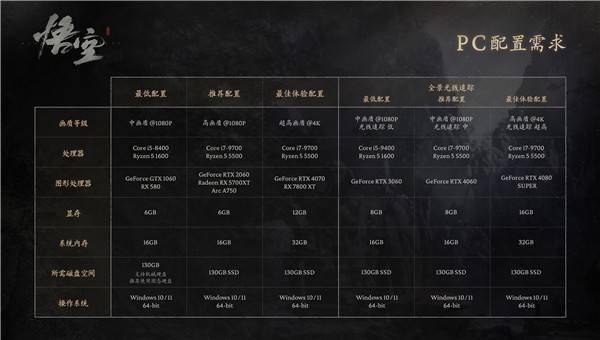 配置要求方面,《黑神话:悟空》为了照顾到广大玩家,GTX 1060即可体验1080P中画质,1080P高画质则需要RTX 2060。如果想要体验4K分辨率下超高画质,那么则需要RTX 4070显卡。此外,游戏体积教导,需要130GB SSD空间。