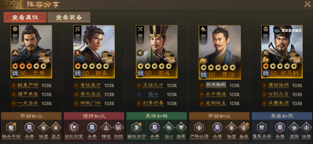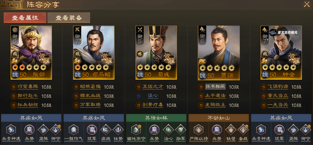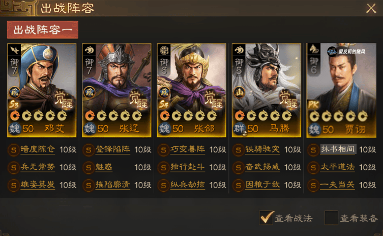 邓艾这里的兵无常势如果是手操的话带暗藏杀机容错率更高,整个队伍以控制起手,张辽邓艾输出,马腾提供增伤。