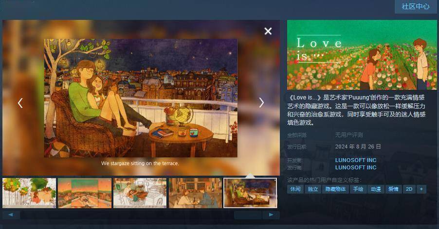 手绘插画情感艺术隐藏物品游戏《Love is...》在Steam平台上线,支持简繁体中文,并将于8月26日发售。这款游戏由知名艺术家“Puuung”创作,带给玩家温馨而治愈的情感体验。