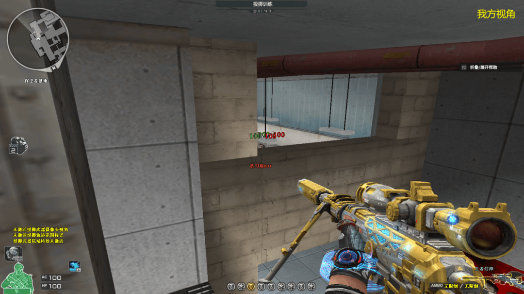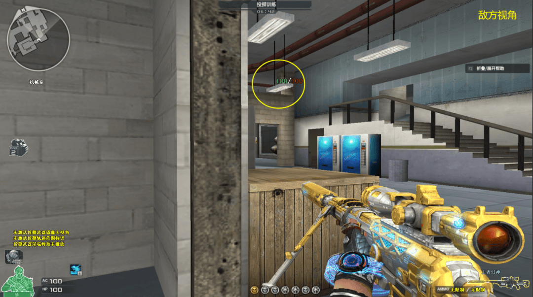 一般潜伏者狙击手进更衣室入口的时候都会先排一下B二楼,在确定二楼没人之后,便会直接闪身出来排黑屋或者B包点导弹后的位置,这个时候我们可以选用上图中这个位置。