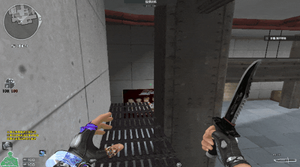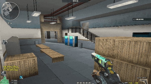 对于潜伏者来说,成功进入更衣室之后,还需要防范走廊附近以及卷底的敌人,如果直接走楼梯上二楼是很容易被打的,或者是在更衣室和卷底对枪,这也是很吃亏的,毕竟人家卷底是蹲起位,所以这里推荐大家直接跳上更衣室的这个高箱。