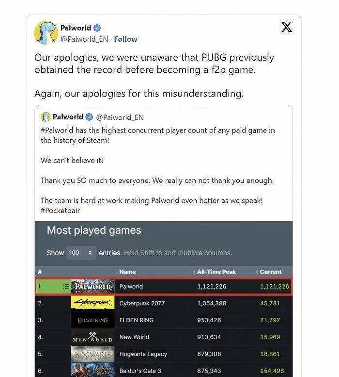 Pocketpair宣布《幻兽帕鲁》成为Steam历史上同时在线人数最高的付费游戏,仅次于免费前的《绝地求生》。
