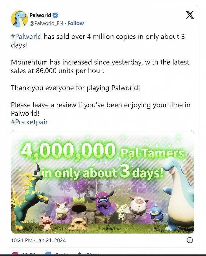 这款游戏1月19日甫一登陆游戏商店Steam和Xbox,瞬时开启了销量狂飙之路。据该游戏开发商Pocketpair公布的数据,游戏上线8小时售出超100万份,此后迅速达到400万份,用时仅两天多。