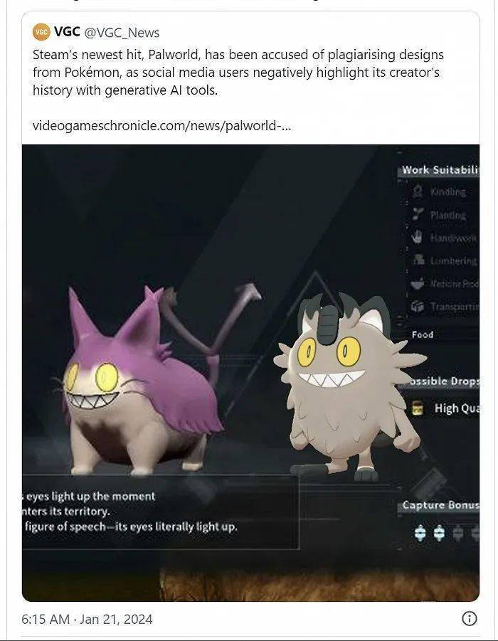 有用户指控《幻兽帕鲁》使用AIGC内容制作怪物“帕鲁”,并存在抄袭《宝可梦》嫌疑。