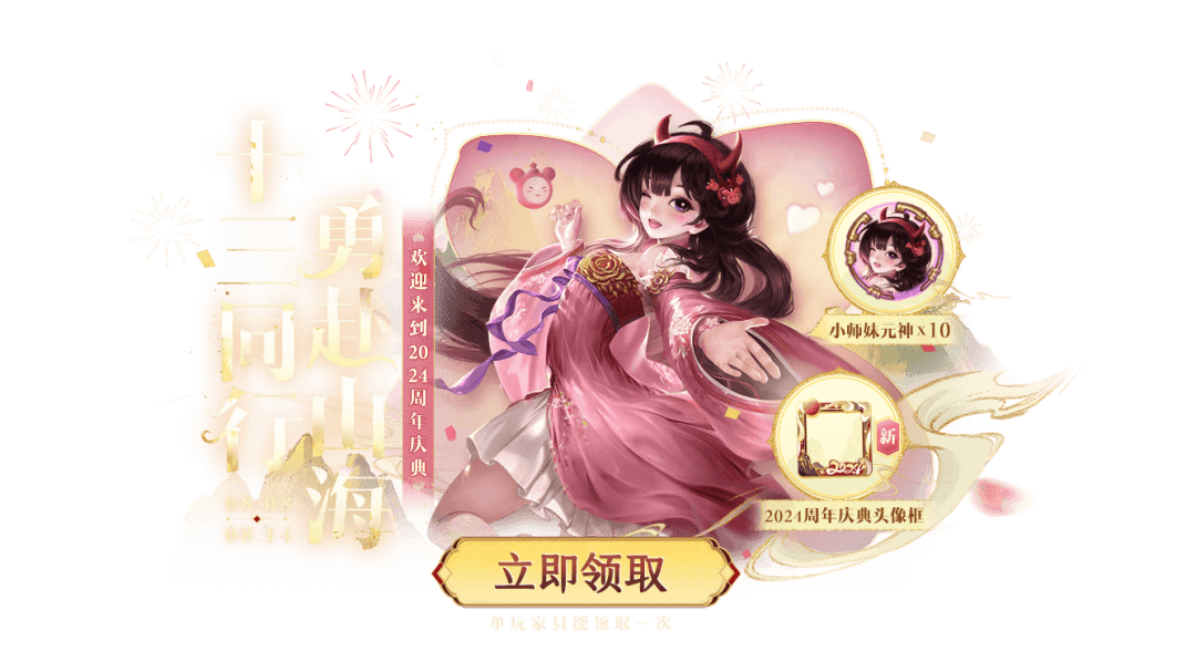 8月8日00:00:00—8月14日23:59:59,期间登录游戏点击活动拍脸宣传大图,即可获得10个小师妹元神以及2024年周年庆纪念头像框,宣传图每日会弹出两次,千万不要错过~
