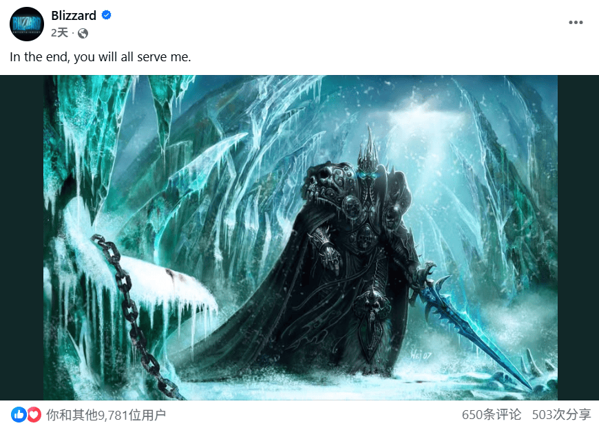另外,在TBC定档的同一天,暴雪官方脸书账号发布一条意味深长的内容:“In the end, you will all serve me”(最终,你们都将臣服于我),配图是手持霜之哀伤的巫妖王。而在最近公布的2026年暴雪嘉年华的预告开头,也出现了巫妖王。这一切,都被认为是周年服未来升“巫妖王之怒”的暗示,甚至有人预测巫妖王前夕将在今年12月份发布。在此之前,官方说法一直是周年服只到TBC结束,包括未来转滚服,还是永久70服也不确定。