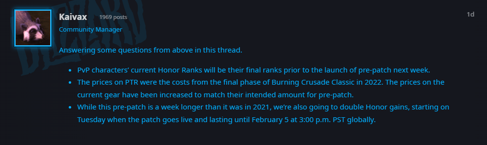 周年服的TBC前夕持续3周(比一怀延长一周),荣誉翻倍从1月15日开始,到2月6日结束。
