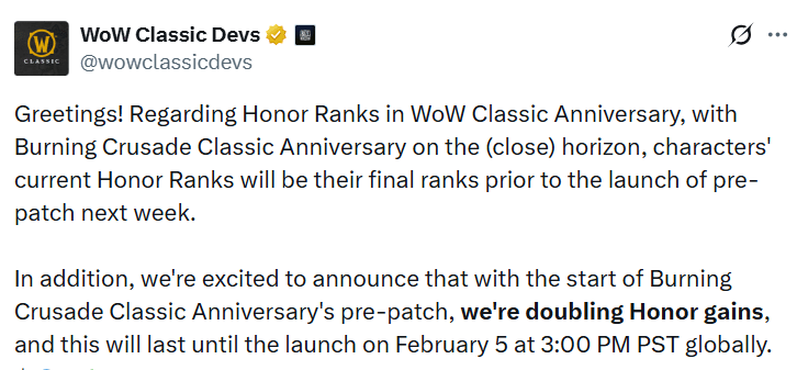 《魔兽世界》20周年服即将在1月15日更新到TBC前夕版本,荣誉系统将迎来一波大调整,旧的军阶制度废除,称号绝版,将使用荣誉点数兑换60级的PVP荣誉装备。而根据最新蓝贴,前夕期间,所有荣誉值的获取量将翻倍。这也意味着在2月6月TBC正式上线前,玩家可以轻松刷满一套荣誉装,方便后面的练级。