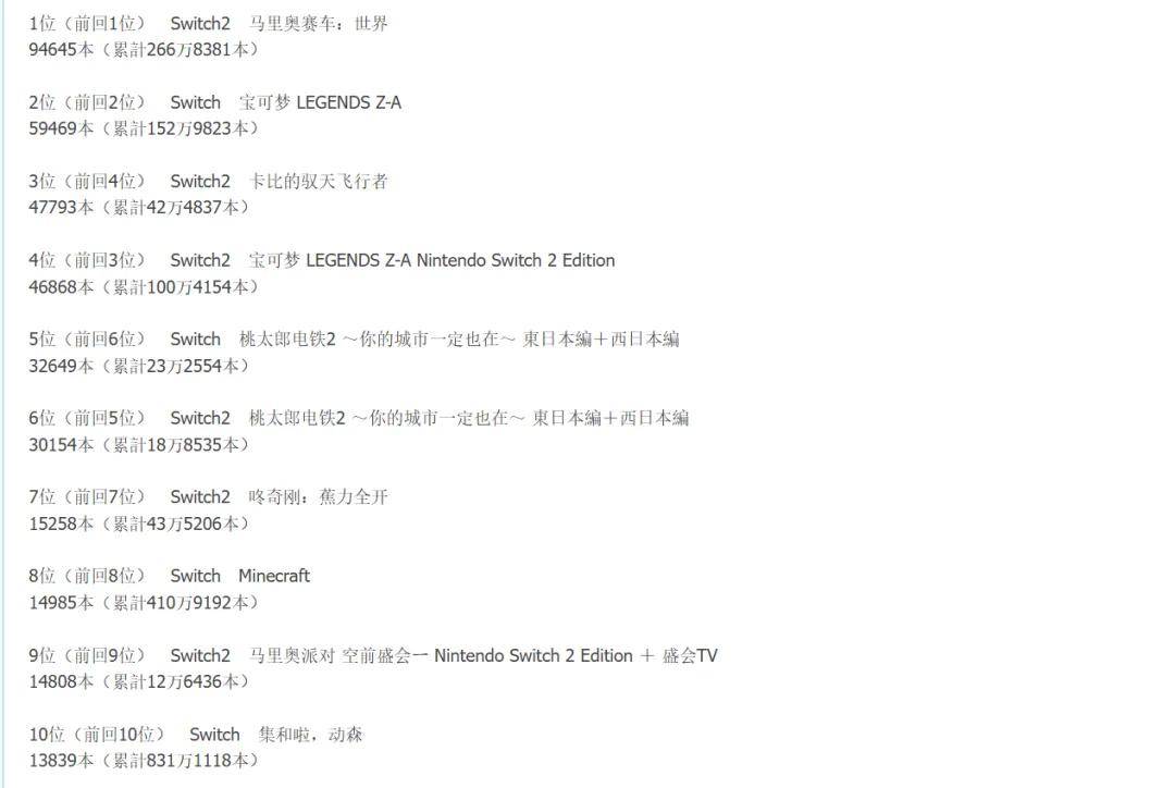 时值圣诞假期,日本地区的游戏销量依然以合家欢的NS游戏为主,前十均为NS和NS2游戏,甚至连动森都翻红进入了前十。