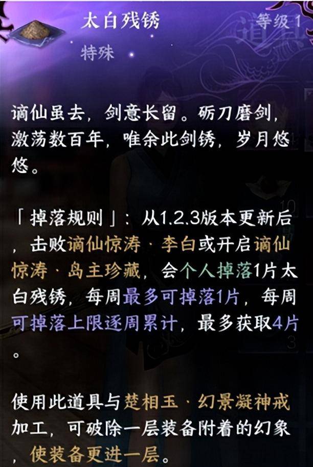 除此之外,还有必定掉落特殊材料【太白残锈】,这可不是无用之物,而是能与连云寨山洞探索得到的独珍【楚相玉·幻景凝神戒】一起加工,便能破除其幻象,进而获得一件的强大装备!
