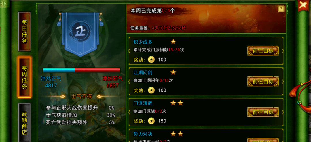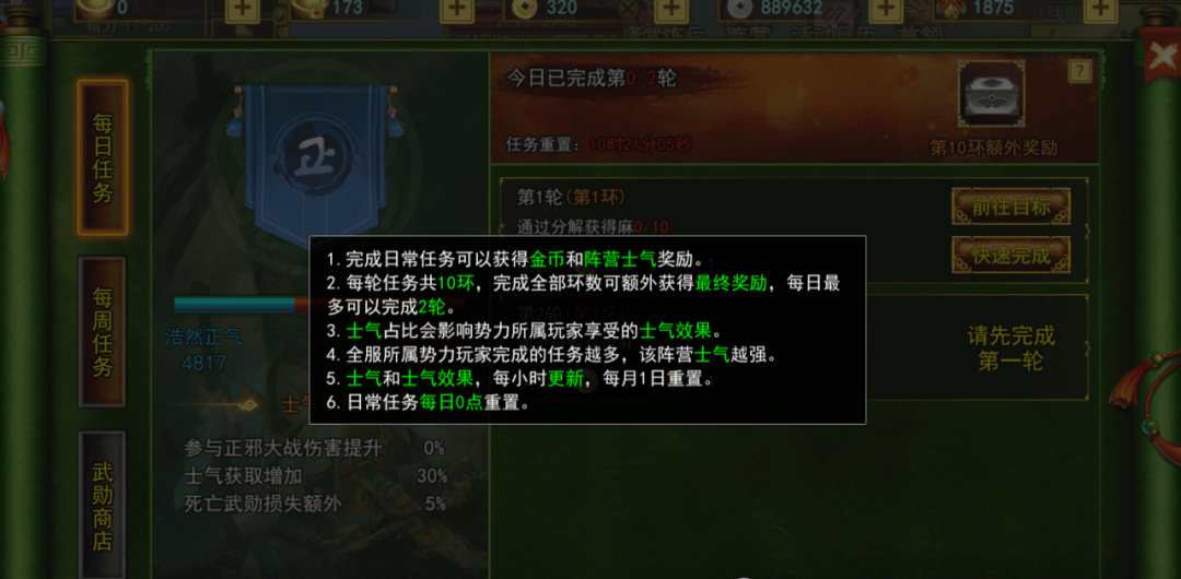 正邪两派的成员可以完成每日人物,可以获得10金币和10的士气,士气占比会影响势力所属玩家享受的士气效果。全服所属势力玩家完成的任务越多,该阵营士气越强。士气和士气效果,每小时更新,每月1日重置。