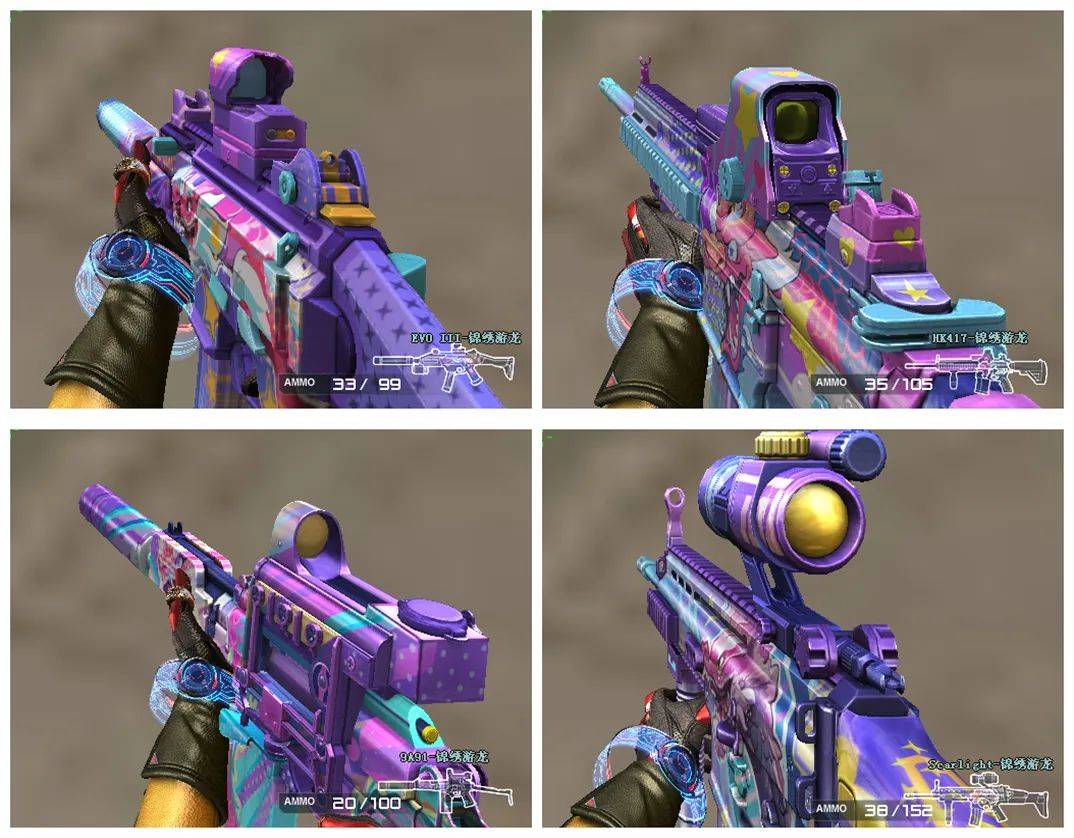 再观锦绣游龙系列中的EVO、HK417、9A91和Scarlight,它们不仅在皮肤方面换上了该系列的专属,还对于枪械配件进行了改进。看到这里,相信有不少CFer都想到了曾风靡一时的赤血龙魂系列,那独特的配件设计可是给我们带来了新奇的战斗体验,锦绣游龙可是将这些武器的特色完美地传承了下来!