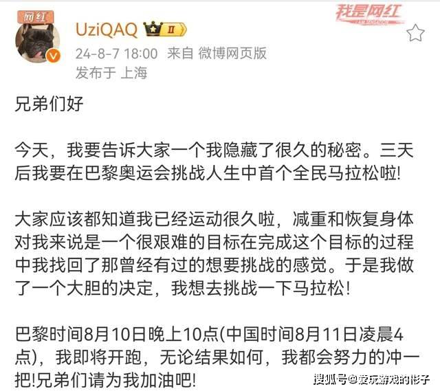 8月7号,LPL夏季赛处于休赛阶段,没有LPL比赛可看,但赛场外的花边消息却不少,比如这次UZI突然在微博上透露自己再次入选了奥运会,还是以运动选手的身份参加的!UZI在微博中表示自己深藏了一个秘密,那就是在国内8月11号凌晨4点要参加本届巴黎的全民马拉松。
