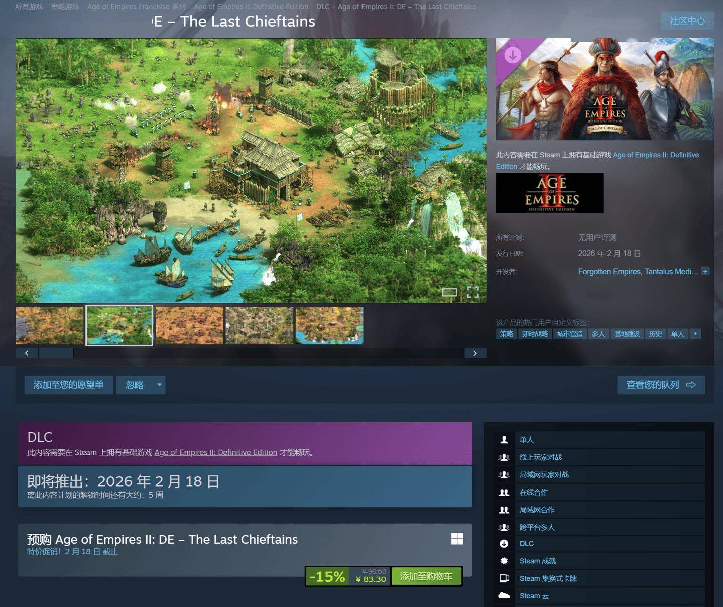 IT之家 1 月 11 日消息,《帝国时代 2:决定版》游戏本周(1 月 8 日)在官网发布博文,宣布“最后的酋长”DLC 将在 2 月 18 日发售,目前已在 Steam 国区开启八五折预购,售价 83.3 元,原价 96 元。(商店页链接:https://store.steampowered.com/app/3219700/Age_of_Empires_II_DE__The_Last_Chieftains/)