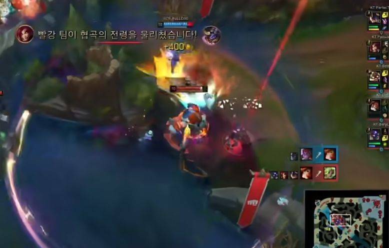 在KT对阵KDF的第一局比赛中,KT在红色方没有禁掉阿萝拉,蓝色方的KDF毫无犹豫在一楼,直接锁定了阿萝拉这个英雄。为了对抗阿萝拉,KT选择了两个长手的英雄,兰博和库奇。阿萝拉的优势是以依靠机动性和手长,来欺负各种短手的英雄,尤其是在打上单位置。如果KDF的阿萝拉是走上路,那遇到兰博就不太好打,最终KDF选择阿萝拉去打中路,补出了奎桑提来打上路。