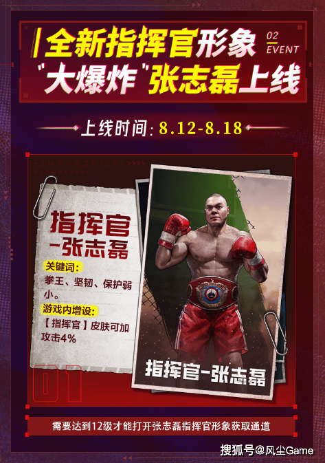全新指挥官形象“拳王张志磊”获取活动将会在8月12日上线,持续至8月18日,活动期间指挥官的游戏等级只需要达到12级,就可以解锁获取通道。想要和拳王一起并肩战斗的指挥官们,别忘了活动上线后前往游戏查看。