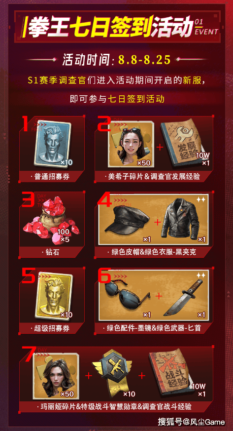 “拳王七日签到活动”于今天正式上线,将会一直持续到8月25日,活动期间S1赛季的调查官们只需要登录游戏完成签到,就可以获得包括钻石、超级招募券在内的丰厚奖励,动动手指就能领取的福利,走过路过记得不要错过哦!