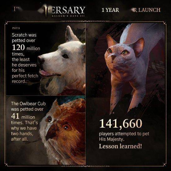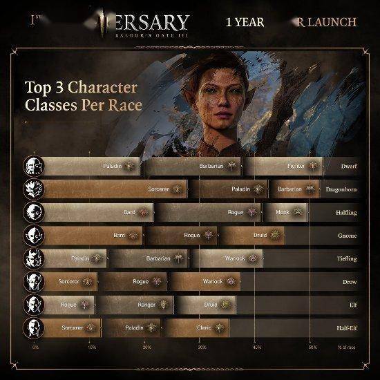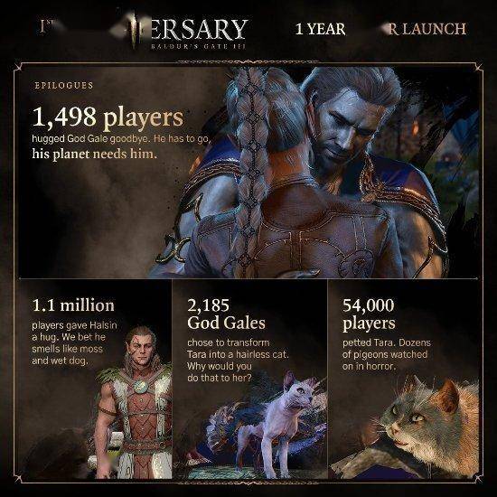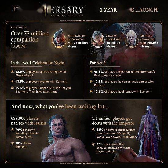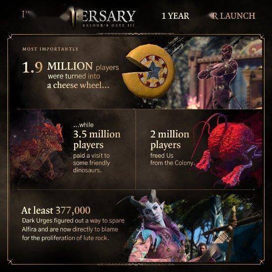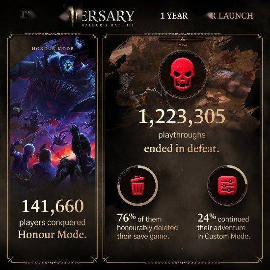 《博德之门3》于最近迎来了发售一周年,拉瑞安再次分享了趣味数据,部分数据如下: