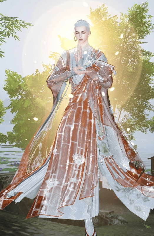 由于男款时装【不负卿愿】本身就有着僧袍样式的袈裟,因此博主@-坏1通过染色将外搭的袈裟染成了《西游记》中的橙红色,经典的砖格造型搭配内衬的白色长衫可谓佛性十足,搭配专门打造的光头造型宛若玄奘在世,独特的佛性美感让不少玩家爱不释手,试问这样造型的圣僧,任谁见了不会心动?