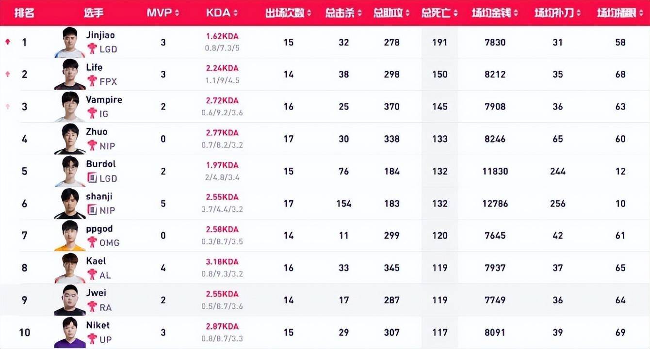 值得注意的是,IG战队的Vampire也在“死神”榜上占据了一席之地,排名第三。Vampire在春季赛期间的表现饱受质疑,但在夏季赛转会到IG后,他的表现显著提升,尽管在死亡数上榜,但他同时也在击杀和助攻数据中名列前茅,展示了全方位的竞技实力。