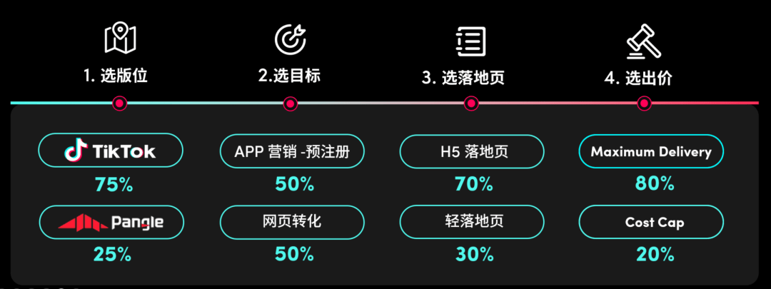为了满足厂商需求,TikTok for Business推出了预注册产品矩阵,助力厂商在选版位、选目标、选落地页、选出价过程中,快速完成投放产品和投放策略的搭配,让游戏赢在起跑线上。